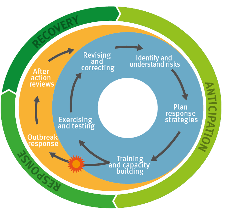 Source: Adapted from Suk J, Van Cangh T, Ciotti M, Ekdahl K. Enhancing public health preparedness: Towards an integrated process. Euroehealth. 2015;21(3). Available from http://www.euro.who.int/__data/assets/pdf_file/0006/287250/EuroHealth_V21n3.pdf, and: Ute Enderlein U, Schmidt T, Esenamanov V, Hommes F. The International Health Regulations (2005) Monitoring and Evaluation framework and its implementation in the WHO European Region. Public Health Panorama. 2018 Mar;4(1):1-46. Available from http://www.euro.who.int/__data/assets/pdf_file/0003/364890/php-4-1-1208-health-regulations-eng.pdf